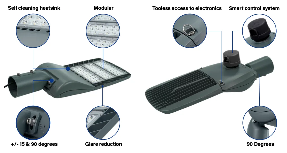 The HiTech Series LED Street Light delivers powerful, energy-efficient illumination for modern urban and industrial environments. Built with precision die-cast aluminum and equipped with high-efficiency SMD5050/3030 LEDs, it achieves up to 180 lm/W brightness with superior uniformity and longevity. Rated IP66 and IK09, it withstands harsh outdoor conditions while ensuring consistent, high-quality performance.