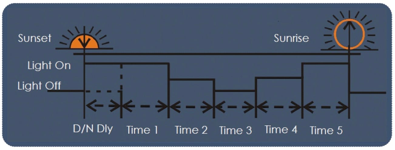 When no motion is detected: 2 hours at 30% brightness; 3 hours at 20%; 4 hours at 10%; and the final 3 hours at 20%.