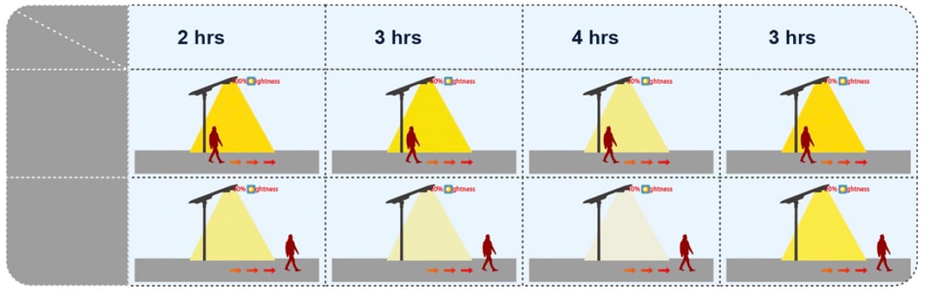 When motion is detected: 2 hours at 100% brightness; 3 hours at 60%; 4 hours at 30%; and the final 3 hours at 70%.